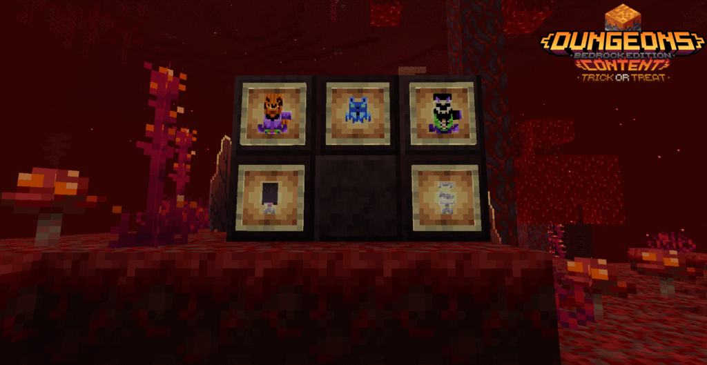 - Armas, armaduras, artefactos y objetos que replican los del Minecraft Dungeons, con habilidades especiales.