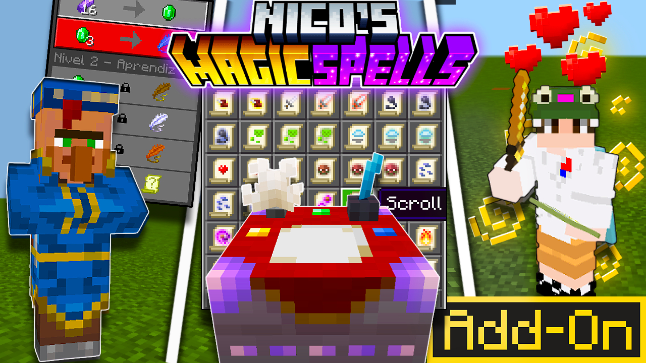 Nico’s Magic Spells añade un sistema de magia basado en pergaminos (scrolls / scroll-spells): más de 70 hechizos personalizados que puedes usar directamente como objetos en el inventario. También incluye aldeanos mágicos, estructuras nuevas tipo bibliotecas o casas de escribas, y lore mágico para darle un aire de RPG o fantasía al juego. Con este addon, puedes lanzar hechizos ofensivos, defensivos, de utilidad o soporte desde ataques mágicos hasta teletransportación, curación o efectos especiales.