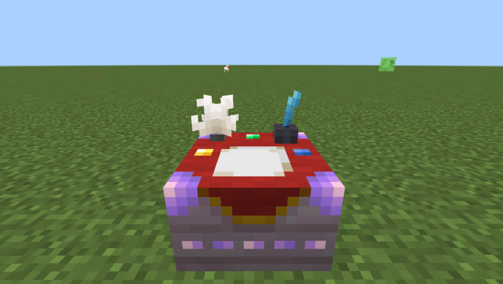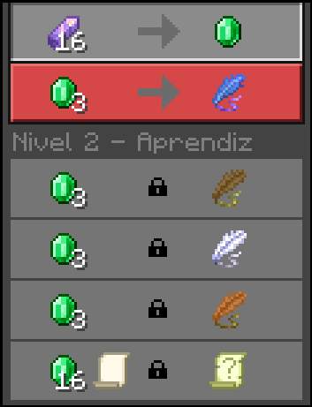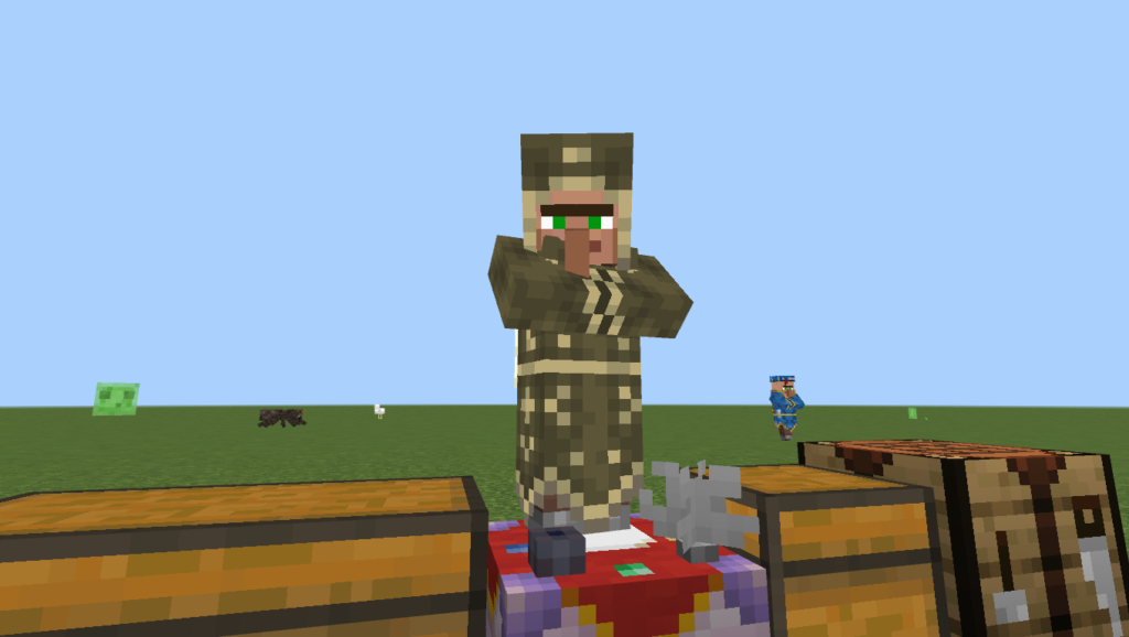 • Aldeanos mágicos: NPCs especiales con los que puedes comerciar para conseguir pergaminos o ítems mágicos. Estos aldeanos usan una mesa de trabajo particular (Fletching Table) como su estación de trabajo.